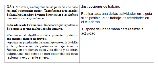 OA 2 Mostrar que comprenden las potencias de base racional y exponente entero: -Transfiriendo propiedades de la multiplicación y división de potencias a los ámbitos numéricos correspondientes