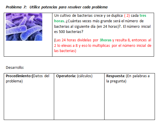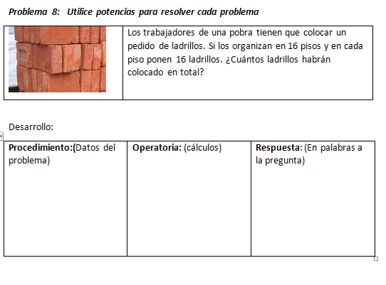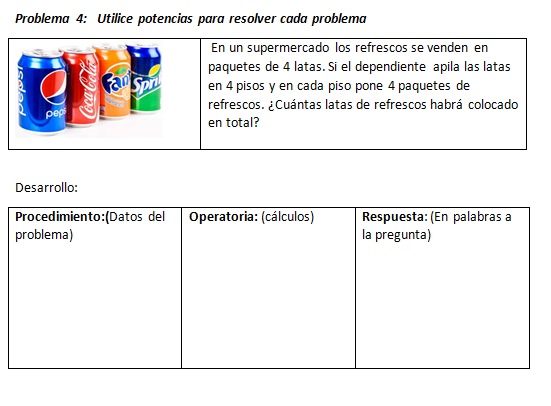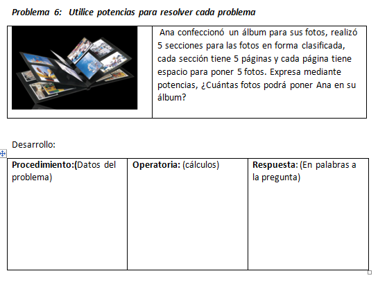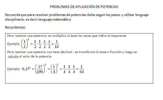 -Aplican las propiedades de la multiplicación, la división y la potenciación de potencias en ejercicios. - Resuelven problemas de la vida diaria y de otras asignaturas, relacionados con potencias de base racional y exponente entero.