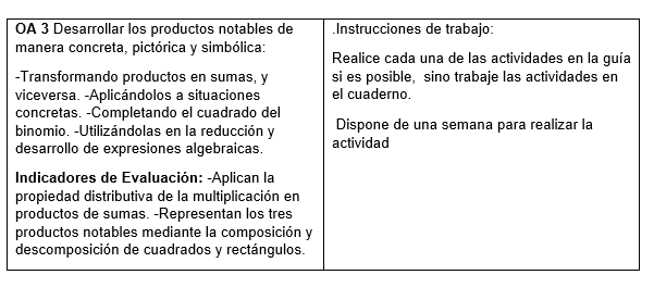 OA 3 Desarrollar los productos notables de manera concreta, pictórica y simbólica: